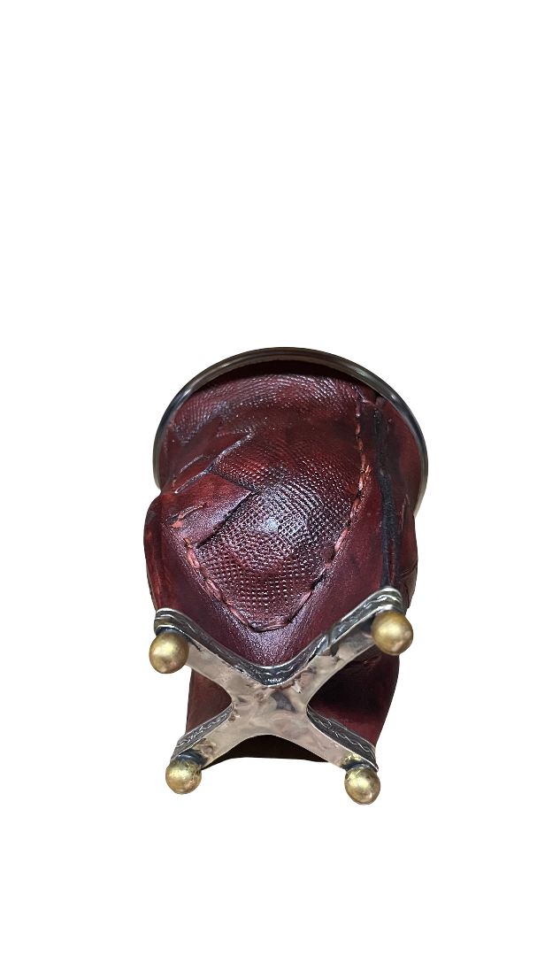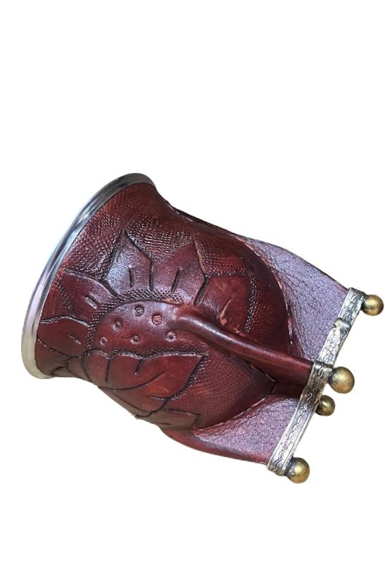 Mate camionero de calabaza, forrado en cuero repujado con patitas de alpaca completa